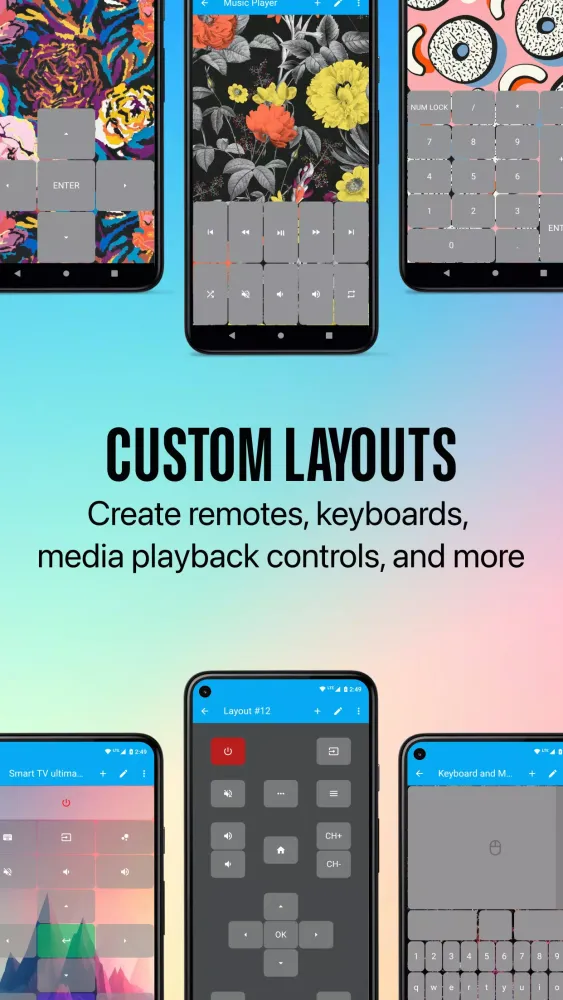 Design your own custom layouts to create a smart TV remote, presentation remote, game controller, tablet remote, or any other Bluetooth interface. These custom layouts can be exported and imported for easy sharing and backups. Creating custom layouts not only combines the functionality of multiple remotes into one but also allows you to switch between different layouts while connected to a device. For example, while connected to a PC, you can toggle between using a keyboard layout for typing, a media player layout for watching movies, and a browser layout for web navigation. To test this feature, delete the default custom layouts and add your own by pressing the add button on the layouts screen.