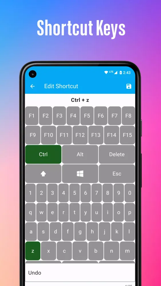 Create custom shortcut keys to send combinations of up to six different keyboard keys simultaneously. For instance, you can set up a shortcut key to send the , , and keys at once to a connected PC. To try this feature for free, simply delete the default shortcuts and add your own by pressing the add button on the shortcuts screen.