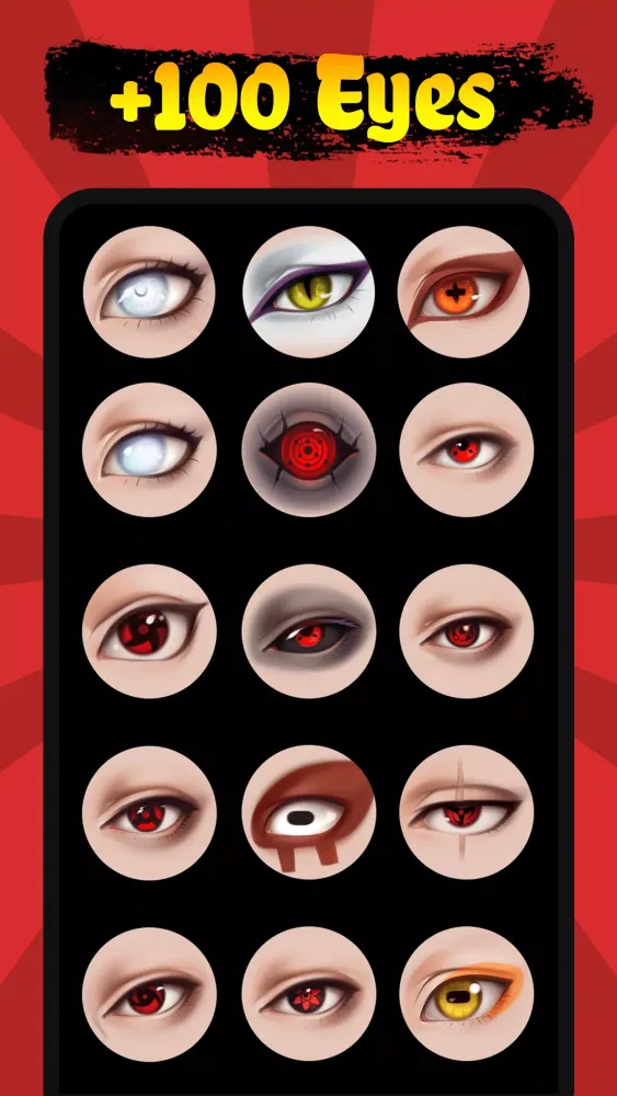- Over 50 unique Sharingan eyes and other eye styles like Mangekyo Sharingan, Nine Tail Sage Mode eyes, and blood effects.