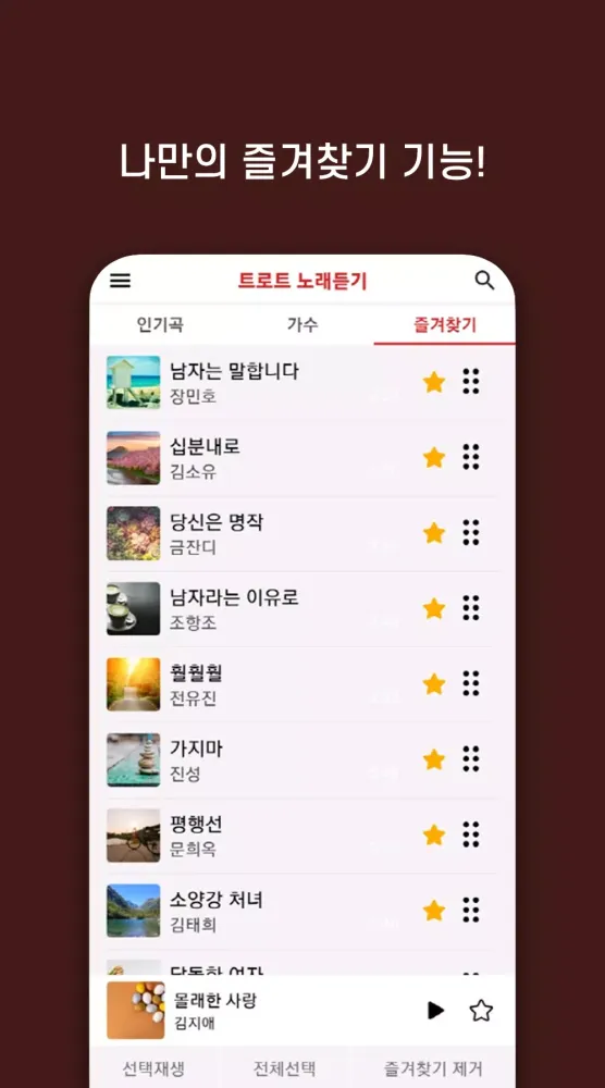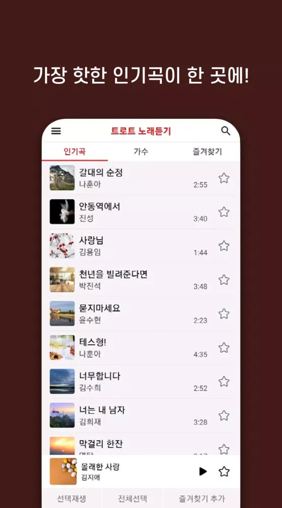 For those who love variety, the app boasts an impressive collection of popular trot artists and their hit songs. Whether you're a fan of legendary singers like Lee Moon-sae, Yang Hee-kyung, or Jo Jin-young, or you're just discovering new favorites, "트로트 메들리" has something for everyone. The app updates regularly with the latest releases and trending tracks, ensuring that you always have access to the most current trot music available.