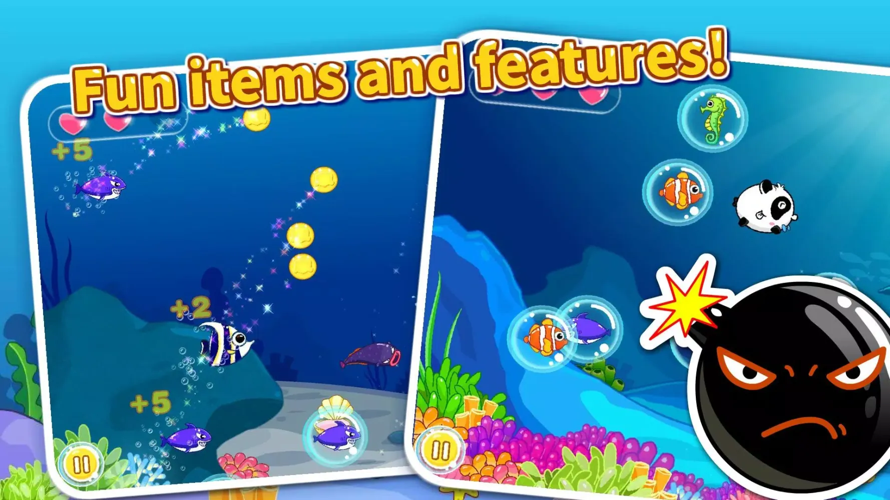 - Bubbles and Bombs: Tap gently to free the fish from their bubbles, but beware of the bombs that could cost you a precious life!