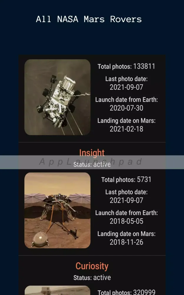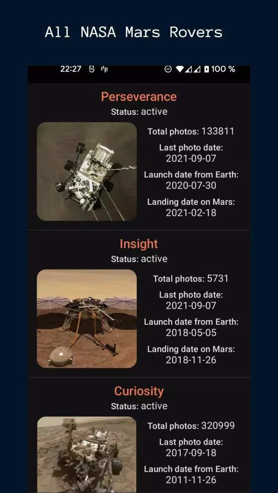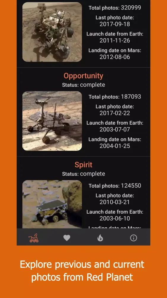 Mars Rover Photos is an incredible application that brings you a vast collection of images captured by NASA's Mars rovers. From the latest missions to historical snapshots, this app aggregates photographs from all major Mars rovers, including Perseverance, Insight, Curiosity, Opportunity, and Spirit.