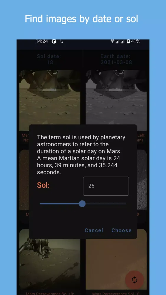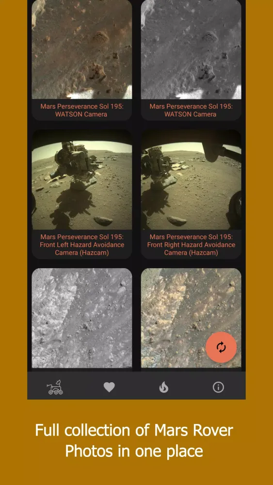 - Refresh Button: Keep your photo library updated with the latest images from Mars by tapping the refresh button located at the bottom-right corner.