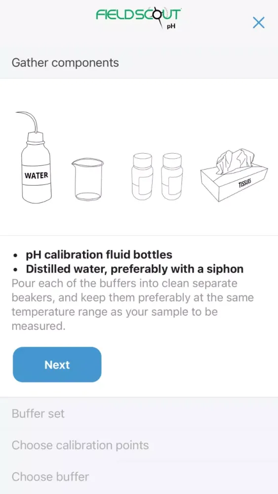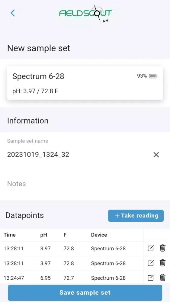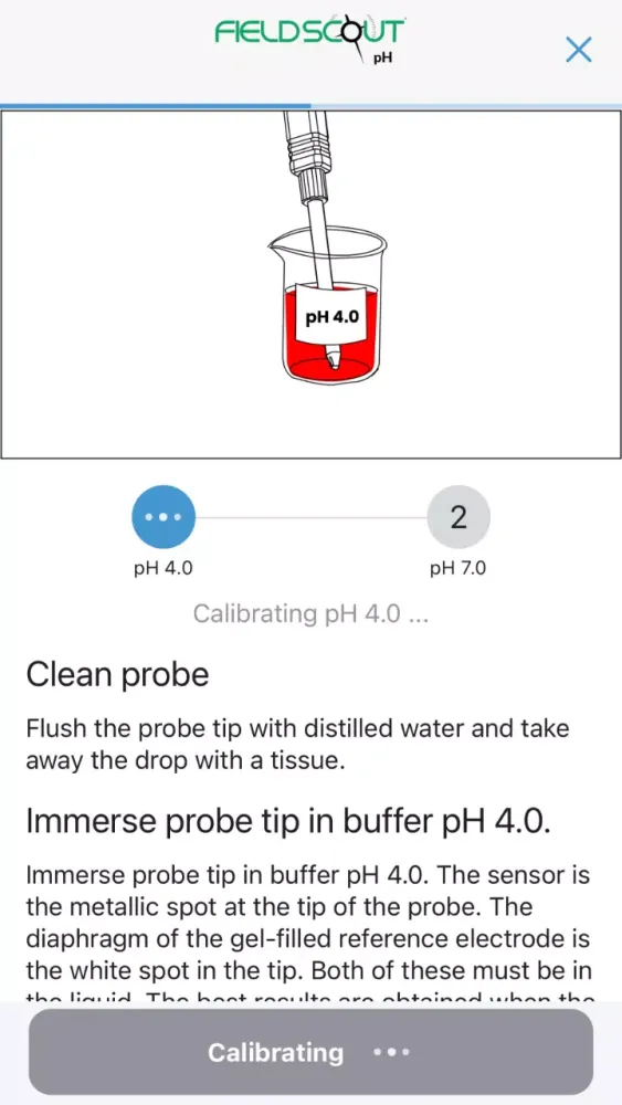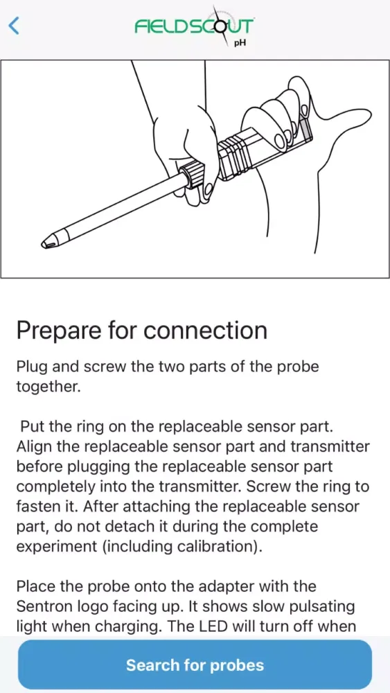 The FieldScout pH/EC/ORP app transforms your device into a versatile and reliable meter by utilizing the advanced FieldScout Wireless ISFET pH and pH/EC/ORP Probes from Spectrum Technologies. To get started, connect your device to one of the compatible probes—either the non-glass pH probe (item 2127W with a blunt tip or item 2128W with a pinpoint tip) or the multifunctional pH/EC/ORP probe (item 2127WE with a blunt tip or item 2128WE with a pinpoint tip)—using Bluetooth Low Energy technology.