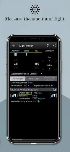 - Calculate the optimum settings according to the lighting of the place (Light Meter)