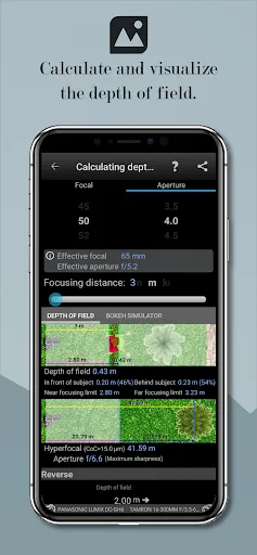 - Calculate the depth of field, hyperfocal and simulation of Bokeh