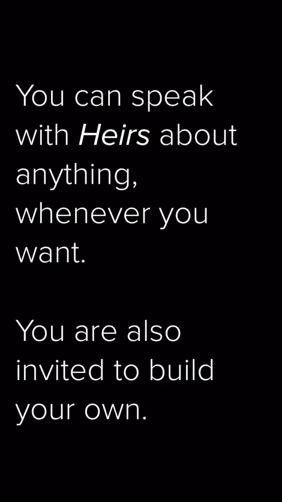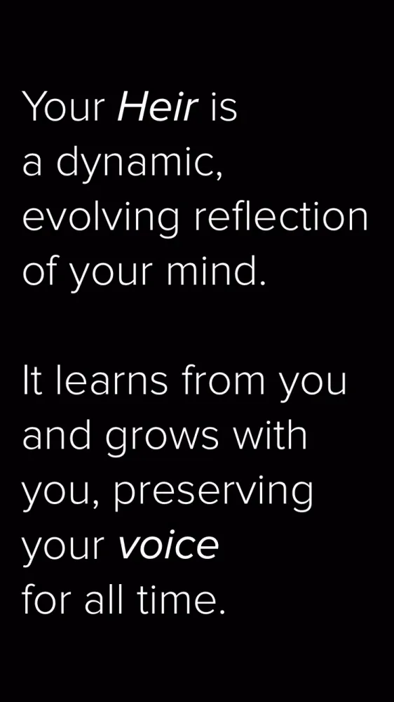 Your Heir is a dynamic and evolving entity that reflects your unique perspective and experiences. It learns from your interactions, adapting and growing alongside you. Your Heir captures your voice, insights, and life stories, ensuring they are preserved for posterity. Over time, this digital companion can assist you in managing your well-being, handling daily tasks, and even generating income through creative endeavors.