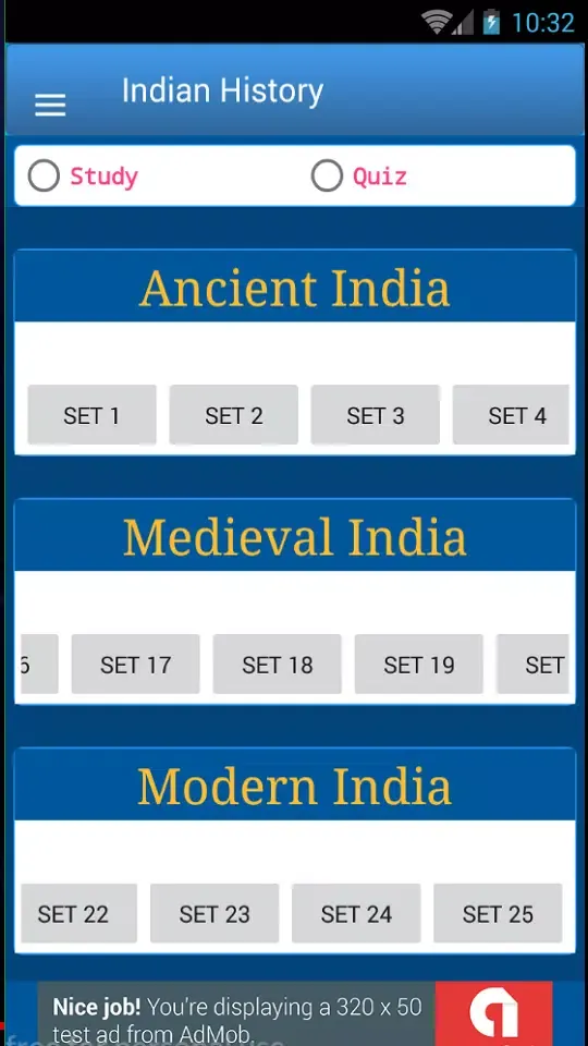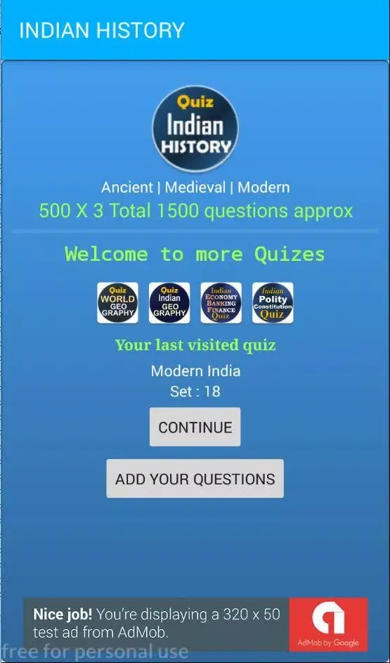 The "Indian History Quiz AIH MIH MO" is an extensive application designed to enhance your understanding of Indian history. It features a comprehensive collection of approximately 1500 multiple-choice questions (MCQs) spread across three distinct eras: Ancient, Medieval, and Modern Indian History. These questions are organized into 25 sets, with each set containing 20 questions, totaling around 500 questions per era.