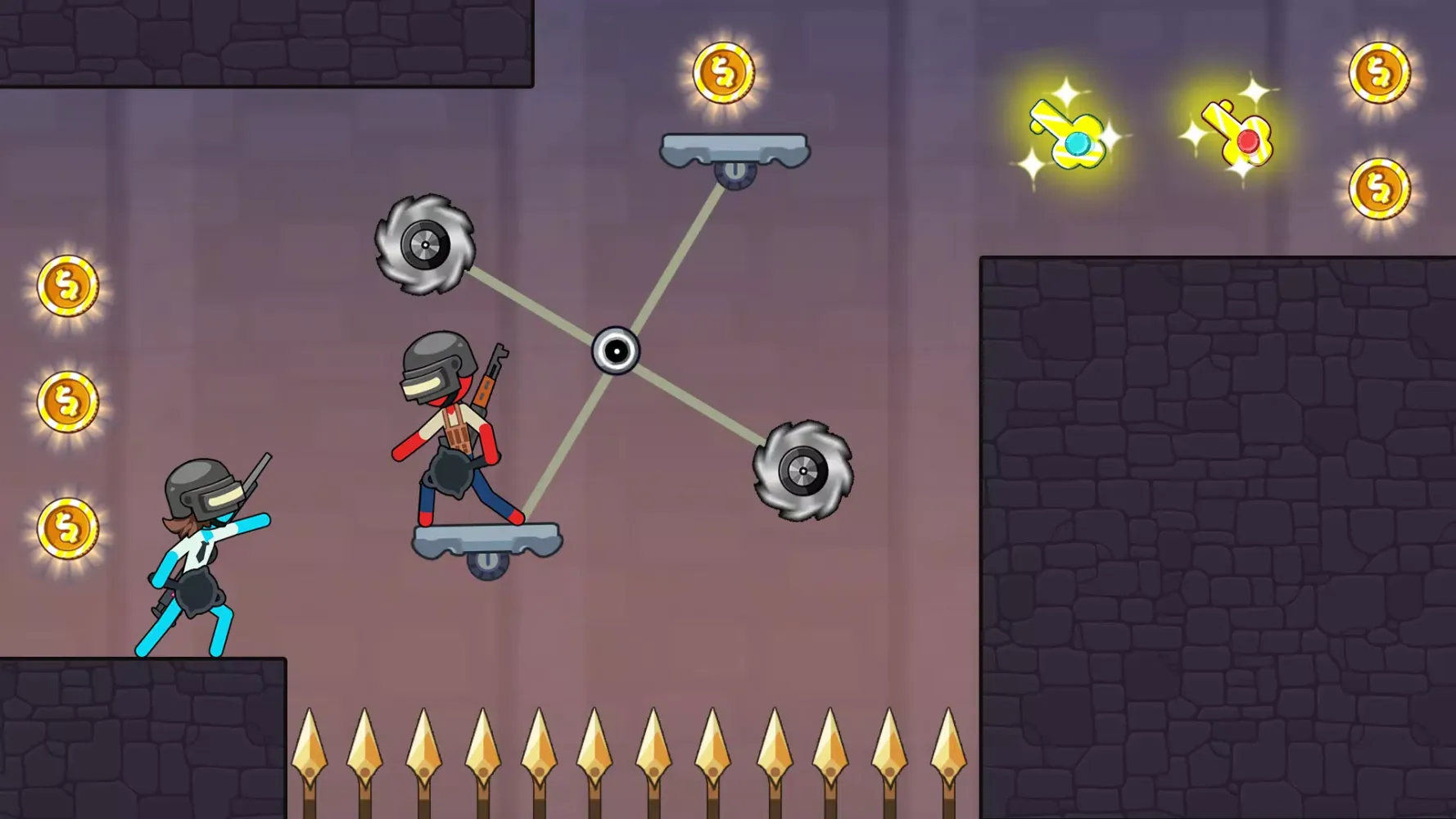 In Stick Red and Blue 3, you'll be controlling two characters simultaneously—Red Boy and Blue Girl—as they navigate through a forest filled with traps and puzzles. Your mission is to synchronize their movements, push boxes, and collect coins to unlock the exit. This unique puzzle game requires teamwork and precision, making it both challenging and rewarding.