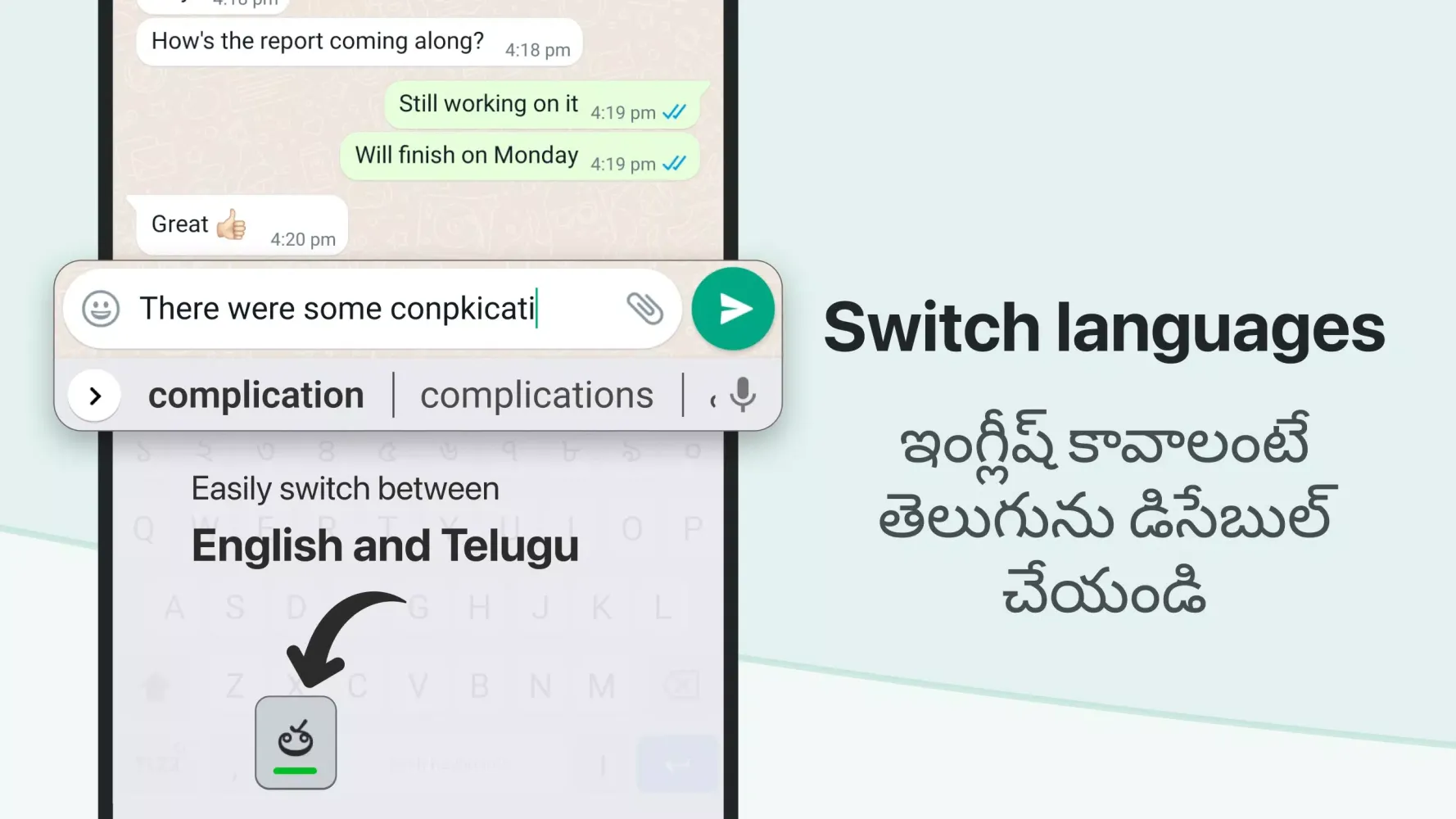 This Telugu Keyboard app allows you to type Telugu effortlessly by simply typing in English. As you type, the app automatically converts your English input into Telugu letters. This makes it incredibly convenient for those who are not familiar with the Telugu keypad and layout. Additionally, the app includes predictive Telugu suggestions that appear as you type, further speeding up the process. Whether you're chatting with friends, family, or colleagues, this keyboard ensures that your conversations are both swift and accurate.