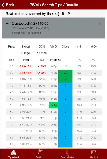 Pulse Width Modulation technology, which is becoming more prevalent for agricultural spraying, is also included within Tip Wizard's searches, making it once again easier to pick spray tips dedicated for that system. It shows the effective PWM duty cycles at any speed, allowing much easier decisions to be made with tip size on a PWM sprayer.