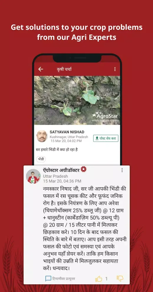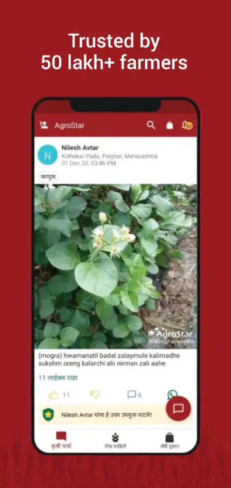 Krishi Charcha is an innovative online helpline within the AgroStar app. Farmers can connect with AgroStar Agri-Doctors and the broader farmer community to discuss their farming and agriculture queries. This feature allows farmers to share their challenges with pictures, videos, and text in their local languages, fostering a collaborative environment for problem-solving.