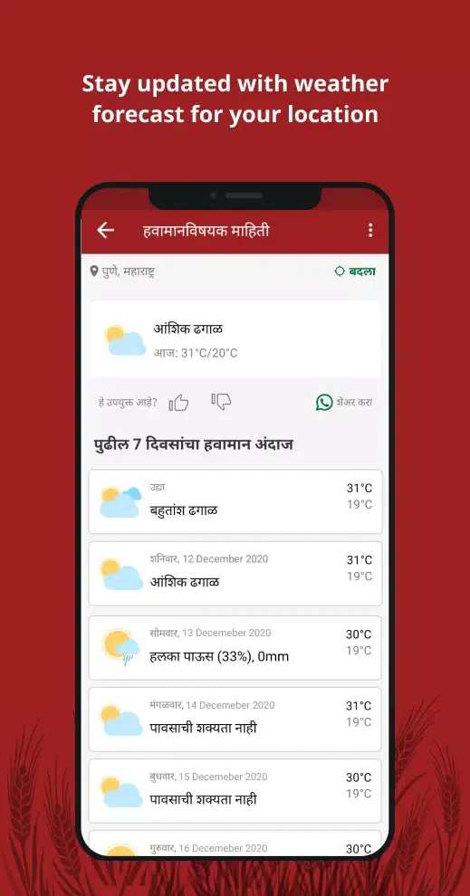 AgroStar app includes an advanced weather widget that provides a 7-day weather forecast, enabling farmers to make informed decisions. The app uses data from AccuWeather to offer accurate updates on rainfall, temperature, and humidity. Emergency alerts are sent out when extreme weather conditions are detected, ensuring farmers are prepared for any eventuality.