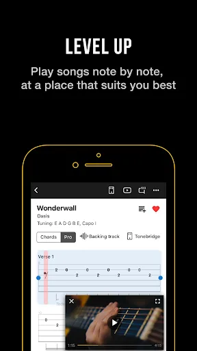 • Play songs note by note, at a pace that suits you best using interactive tabs (Tab Pro)