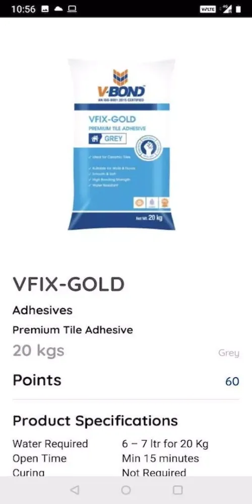 The VBOND Partner App is designed to reward you for scanning barcodes from our bags. Value Pack India Private Ltd, an ISO-9001:2015 certified company, has been a leader in manufacturing, supplying, and providing services related to tile adhesives, tile grouts, epoxy tile grouts, wall care, textures, AAC block jointing mortars, paints, and primers since 2014. Our mission is to ensure maximum customer satisfaction through superior quality and service.