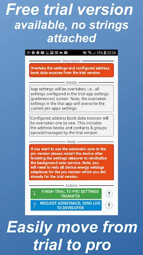Do you want to check out the app for free? You can test the app and all its features without any limitations for two weeks. Simply install its free trial version from: https://play.google.com/store/apps/details?id=com.vcard.android.free