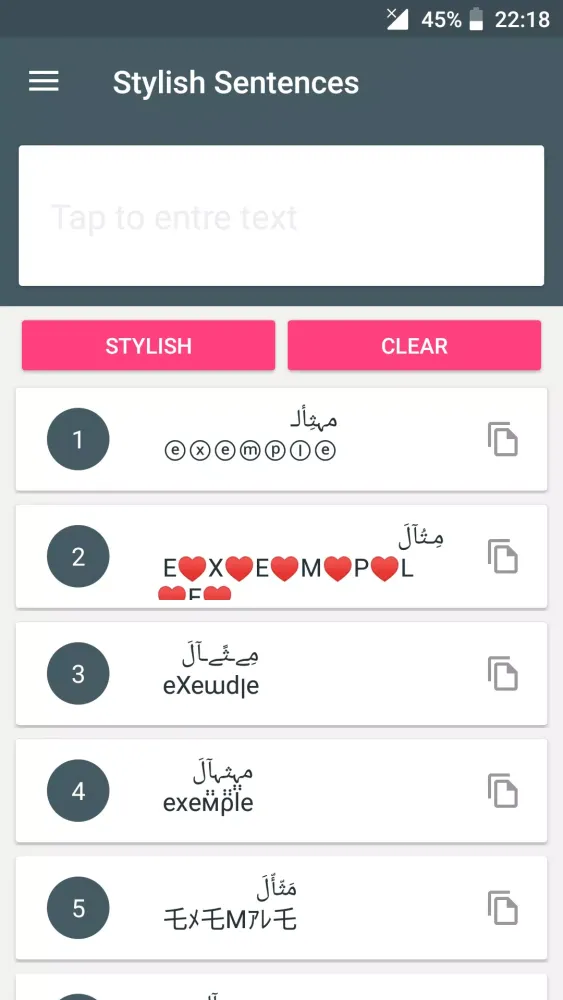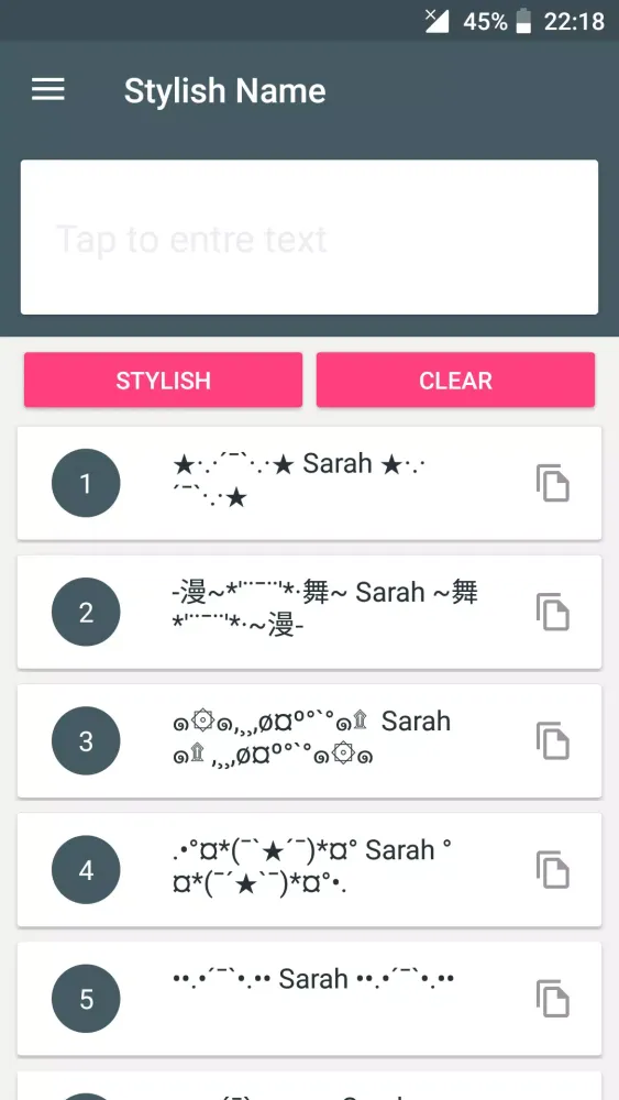 The application boasts a diverse selection of decorative elements, including distinct lines and patterns that can be applied to any text input. These decorations cater to various tastes and preferences, allowing users to choose from multiple styles to match their mood or occasion. Whether you're creating nicknames for online gaming platforms like Nick Nim, personalizing your social media profiles on Facebook, or crafting creative messages for WhatsApp, the possibilities are endless.