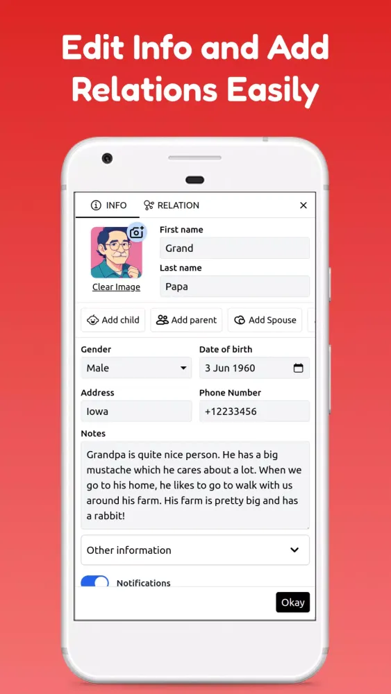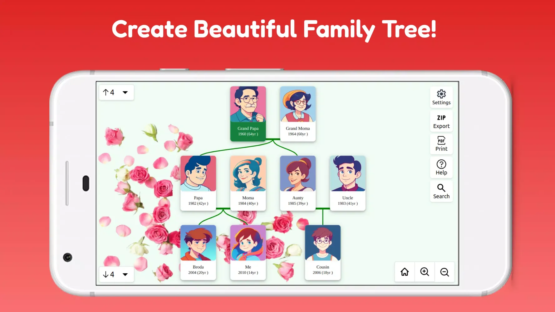 The app allows you to input essential details about each family member, including names, genders, dates of birth, and even dates of death. Additionally, you have the flexibility to upload photos for each individual, making your family tree more personal and visually engaging. This feature ensures that every member of your family is represented in the most meaningful way possible.