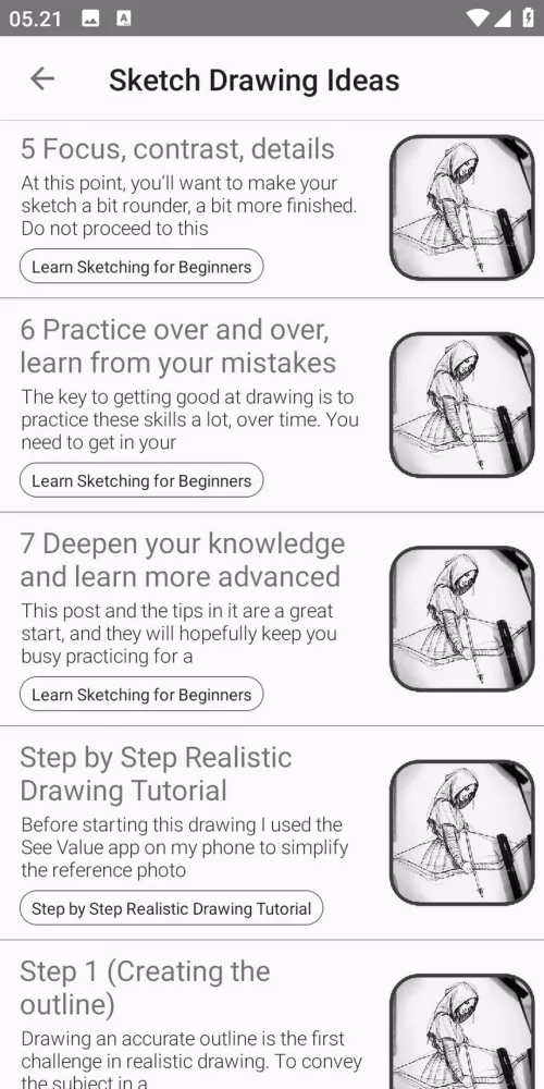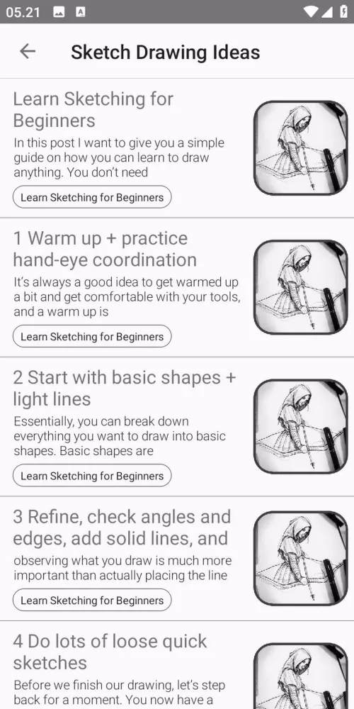 In summary, Sketch Drawing Ideas is an indispensable tool for anyone passionate about sketch drawing. It offers a vast collection of creative ideas, personalized recommendations, and educational resources, all within a single, user-friendly application. Whether you're drawing for leisure or pursuing a professional career in art, this app will serve as a valuable resource to help you unleash your creativity and achieve your artistic aspirations.