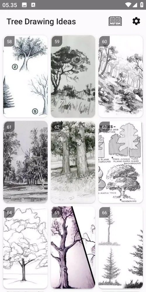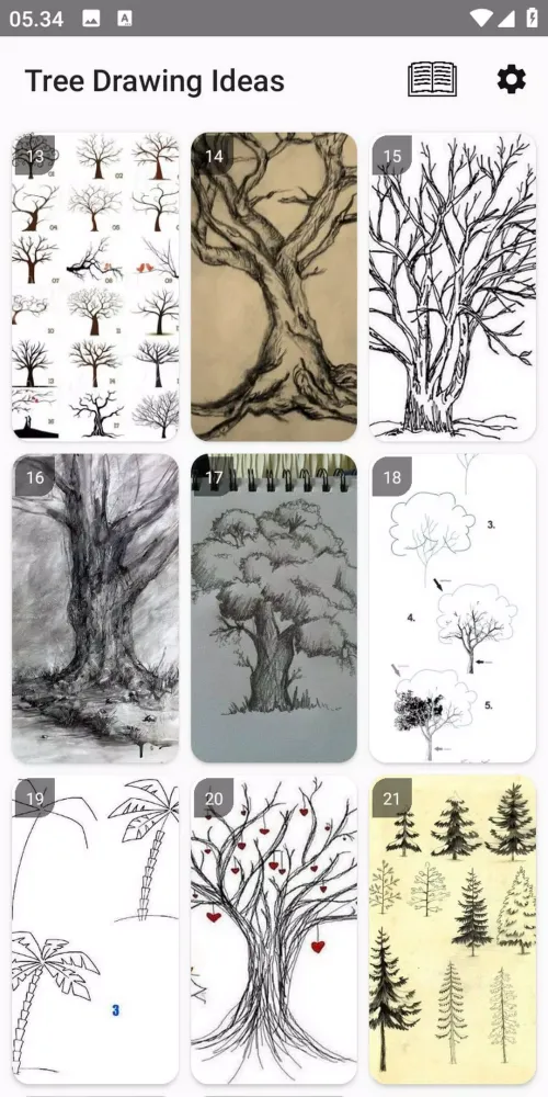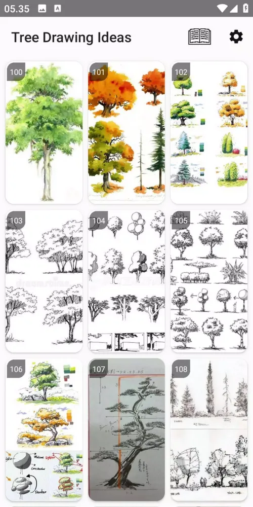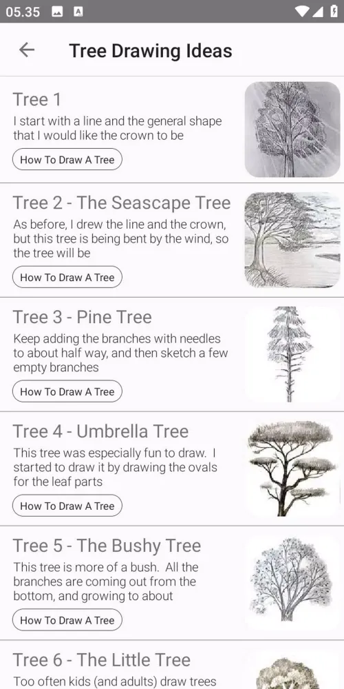 The app includes a variety of tree drawing ideas that cater to different styles, techniques, and themes. Here are just a few examples: