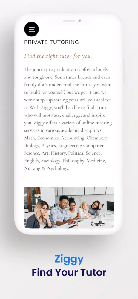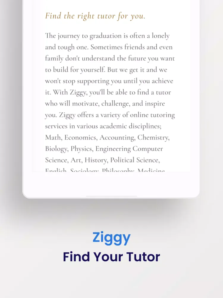 We believe in empowering students to reach their full potential. With Ziggy, you'll have access to a wide range of resources, including one-on-one tutoring sessions, study guides, and practice tests. Our tutors are available 24/7, so you can get the help you need whenever you need it. Say goodbye to the stress and isolation of studying alone; join Ziggy today and take the first step towards a brighter academic future.