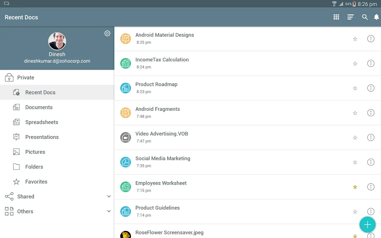 Zoho Docs is an online document management application for individuals and businesses. This mobile version extends access to your documents to Android mobiles. If you don't already have a Zoho account, you can easily create one within the application.