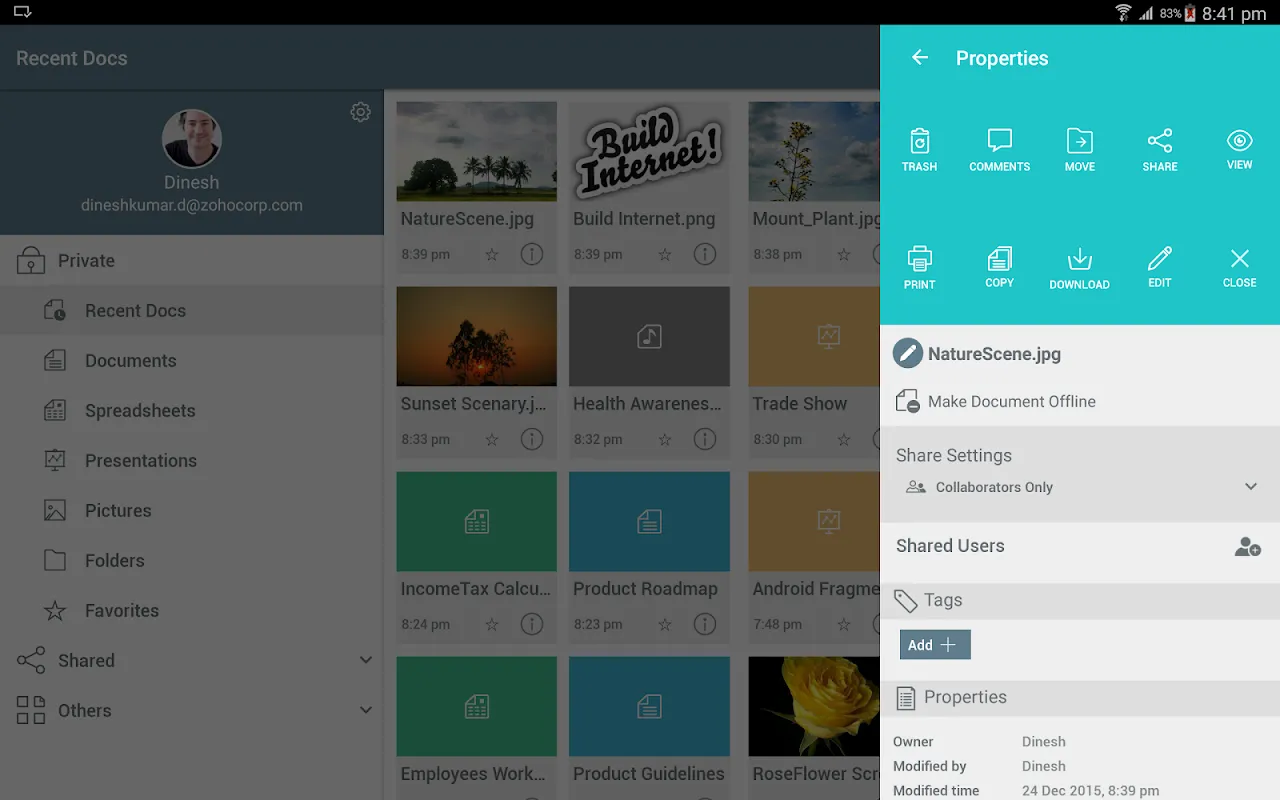 * Access your documents created in online versions of Zoho Writer, Sheet, Show & Docs