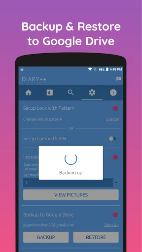 You can backup all your diary data to your own Google Drive storage in a secure way and also you can restore them from Google Drive to your device at any time. This feature will be handy when you are changing your device or lost your device.