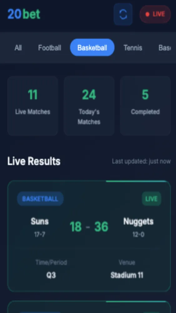 Track every ball, goal, and point with 20Bet Sports Book Live Result – India’s go-to app for live sports scores, match stats, and betting insights.