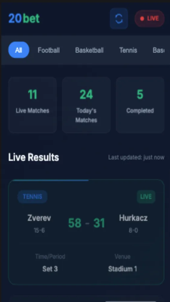 Whether you're a sports enthusiast or a bettor, 20Bet Sports Book Live Result keeps you updated with real-time scores, detailed match analysis, and fast notifications across all your favorite sports – especially cricket and football, India’s most loved games.