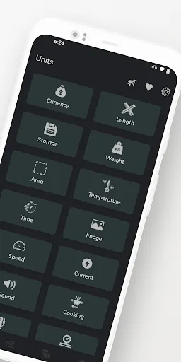 Currency calculator, Length, Storage, Area, Weight, Temperature, Time, Image, Speed, Current, Sound, Cooking, Fuel Consumption, Pressure, Energy, Force, Fuel Efficiency-Mass, Fuel Efficiency-Volume, Heat Density, Heat Capacity, Angle, Resolution, Magnet, Solution, Prefix, Charge, Electric Potential, Inductance, Electric Resistance, Electric Resistivity, Volume, Torque, Inertia, Density, Angular Velocity, Angular Acceleration Viscosity, Flow, Permeability, Concentration, Field Strength, Linear Charge, Surface Charge, Volume Charge etc.