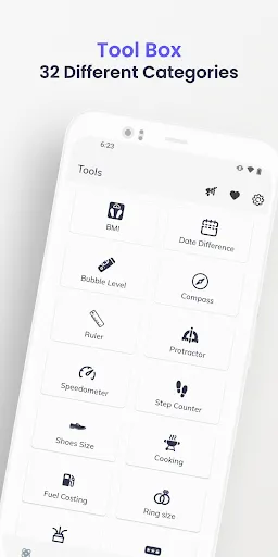 BMI, Bubble Level, Compass, Ruler, Date Difference, Speedometer, Step Counter, Shoes Size Measurement, Cooking Measurement, Ring Measurement, Wire Measurement, Password Creator, Cryptography, Protractor, Metal Detector, World Time, Morse Converter, RGB/HEX Color Converter, Case Converter, etc.