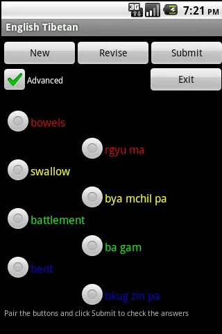A. Select New, then touch the head word in the left column and it's matching word in the right column. Its colour will change. Repeat this for all words and then select Submit to check the answers