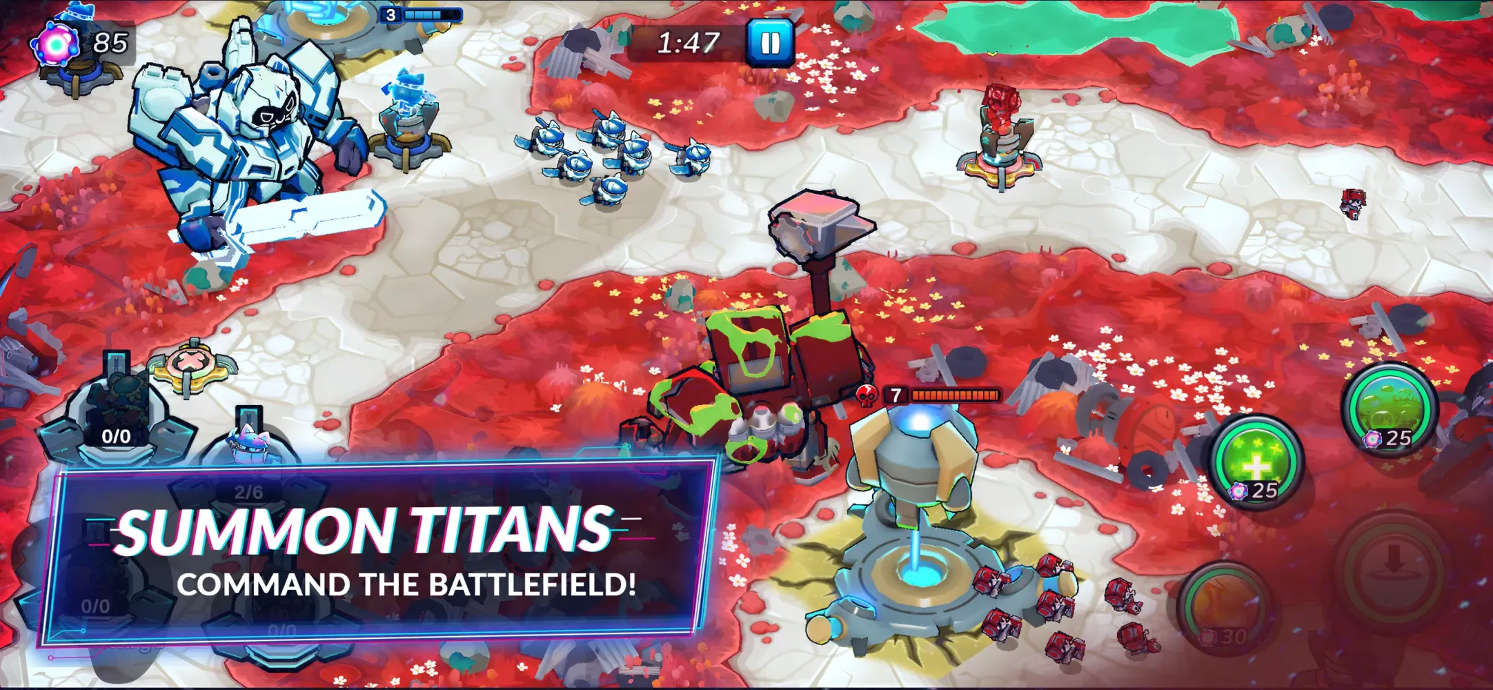 Command your Titans and armies in thrilling, large-scale real-time strategy battles. Deploy towers, construct defensive lines, and launch devastating attacks with powerful Titan abilities like Flame Strike. Epic battles will push your strategic skills to their limits. Compete in tournaments and climb the ranks to become the ultimate strategist.