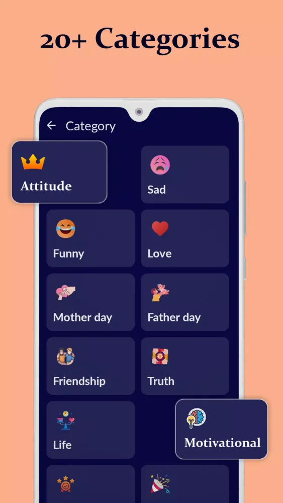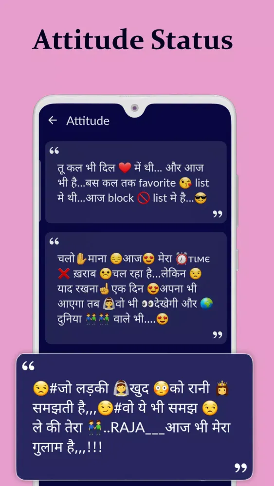 - 20+ Categories: Explore various categories such as Attitude status, Love status, and Motivational Quotes.
