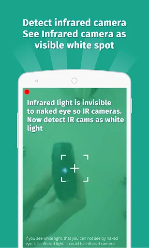 Infrared camera detector - This app has one more tool which is detect infrared lights.Just open the infrared detector and scan for white light that appear on screen but not visible by naked eye. Such white light indicate infrared light.It could be infrared camera. Your normal cam can also detect it but what we have is inbuilt feature with luminescence effect.
