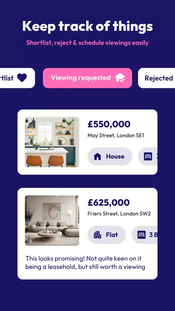 看到您喜欢的房子了吗?将其加入短名单,联系代理商或安排看房。想要更改?Locky 会根据您的反馈进行调整。🏠 -