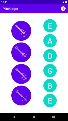 Simple instrument pitch pipe with presets for guitar, ukulele, mandolin, and 5-string banjo.