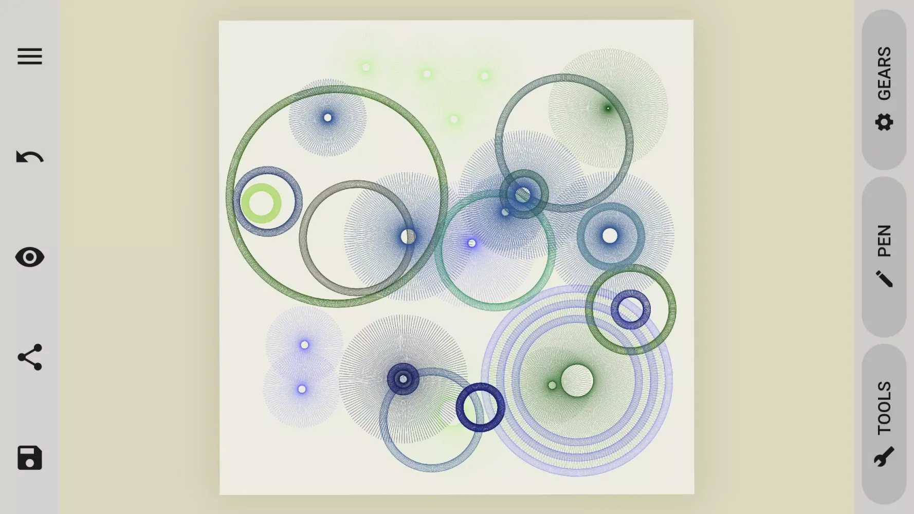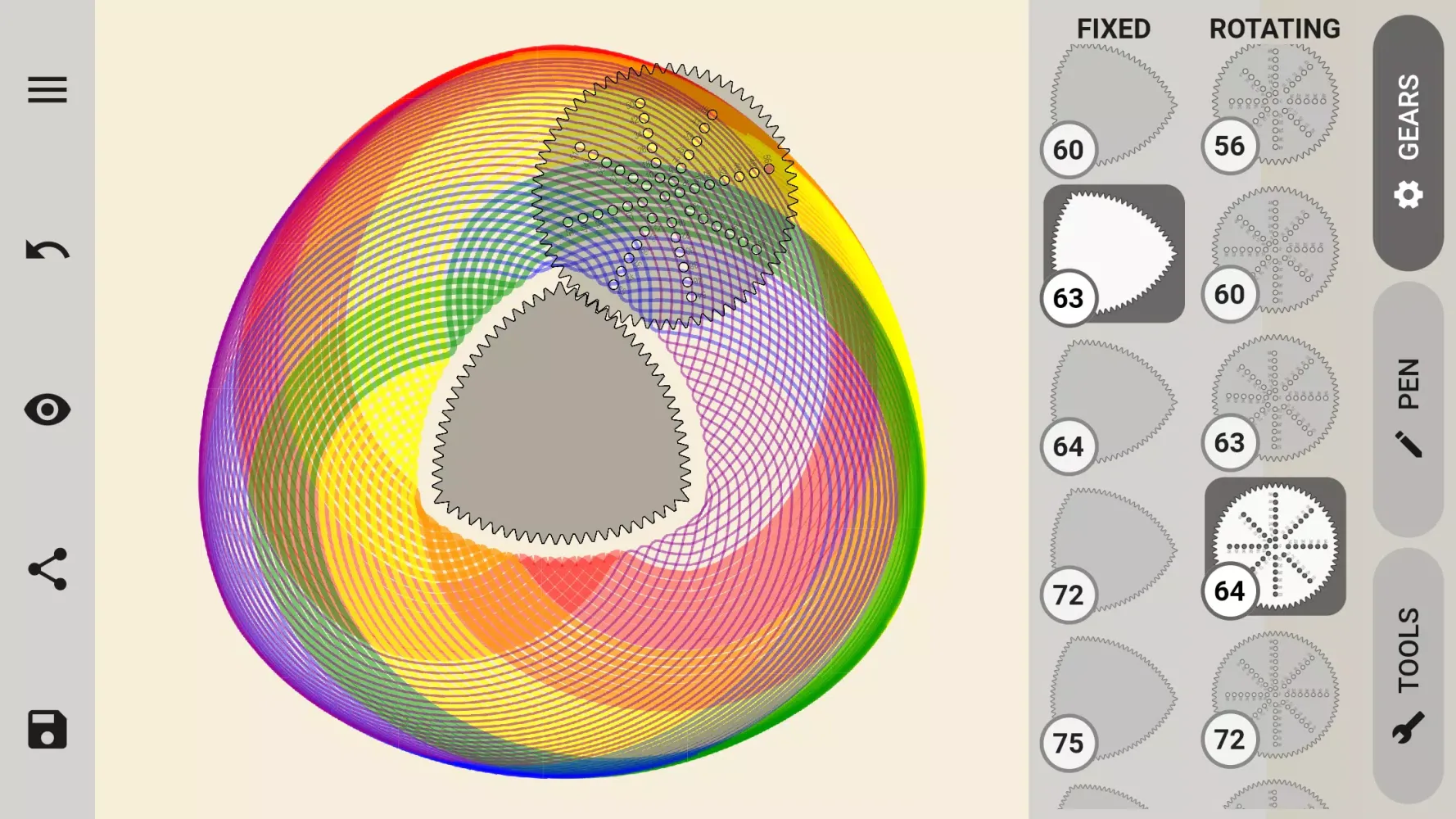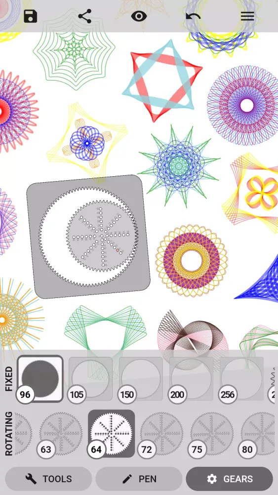 The app includes over 150 gears, ranging from basic shapes like circles, ovals, triangles, and squares, to more complex ones such as pentagons, rings, beams, and unique forms. You can select from over 5000 pen holes to fine-tune your design, and enjoy a multitude of features that enhance your creative journey.