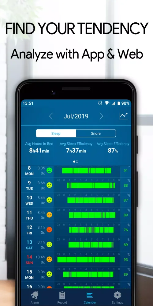 Simply tap the "Bedtime" button when you go to sleep and swipe to turn off the alarm when you wake up. JUKUSUI will generate a detailed daily sleep log that includes your sleep quality, efficiency, duration, and even snoring patterns. This data provides valuable insights into your sleep habits and helps you make informed adjustments.