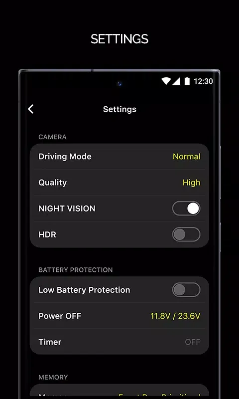 Adjust various settings on your dash cam using the app, including motion sensitivity, parking mode, sound, LED, and battery protection mode (LBP).