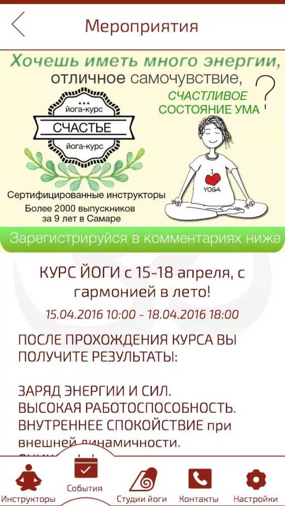 Do you own a yoga studio? Easily create and manage events directly within the app. Navigate to the "contacts" section and follow the provided link to access these features. Promote your events and share them with the broader yoga community.