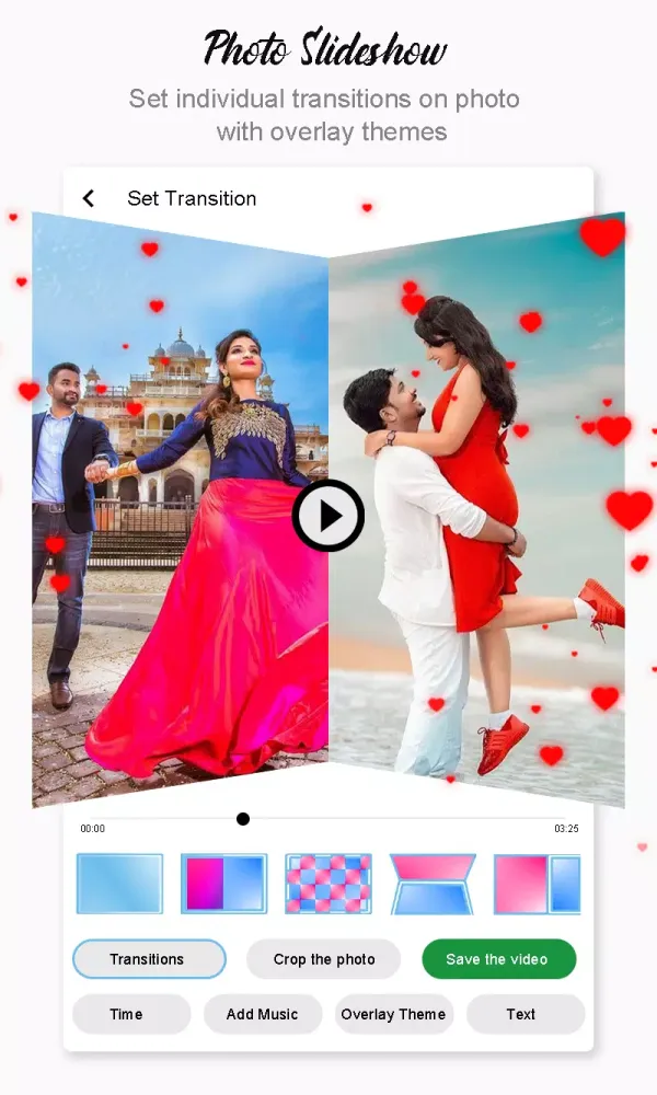 The process of creating a photo slideshow video is straightforward yet versatile. Start by selecting multiple photos from your device’s gallery—arranging them in the desired order is simple thanks to the intuitive interface. Once your images are in place, crop them to maintain aspect ratios, ensuring that every shot looks its best. Next, apply unique transitions like hearts, rectangles, triangles, diamonds, circles, and more to each individual photo, giving your slideshow a dynamic flair. For added charm, you can download and apply love-themed animated GIFs to infuse an extra layer of emotion into your project. These effects not only enhance visual appeal but also help convey deeper sentiments.