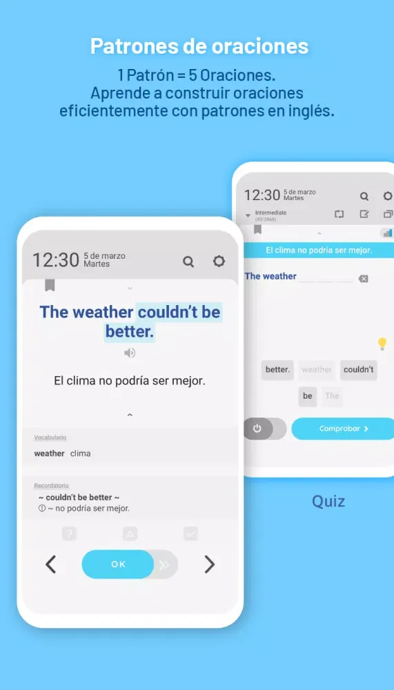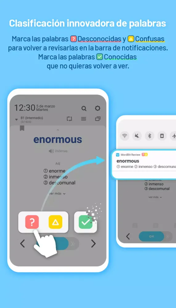 Beyond delivering high-quality educational content, WordBit Inglés equips users with numerous interactive tools designed to reinforce learning outcomes. A built-in quiz feature allows you to test your recall of recently encountered terms, helping solidify memory retention. The "cover mode" enables self-assessment by hiding definitions until needed—a great way to challenge yourself mentally. Additionally, the daily repetition option lets you revisit key vocabulary items throughout the day until they stick permanently in your mind. If desired, you can customize your study lists by marking mastered words as completed, thus streamlining future practice sessions.