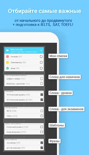 Вы можете изучать слова и фразы, подходящие для вашего уровня. (Более 15000 слов от начального до продвинутого)