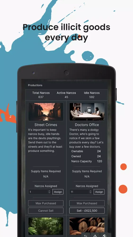 In "Cartel Empire," you can expand your influence and wealth through various means. Acquire unique production facilities to generate merchandise and wealth daily, which can be traded on the player-run La Paz Market. Alternatively, visit Julio's Club to recruit fearless sicarios (hitmen), arm them to the teeth, and send them on missions to acquire vast riches.