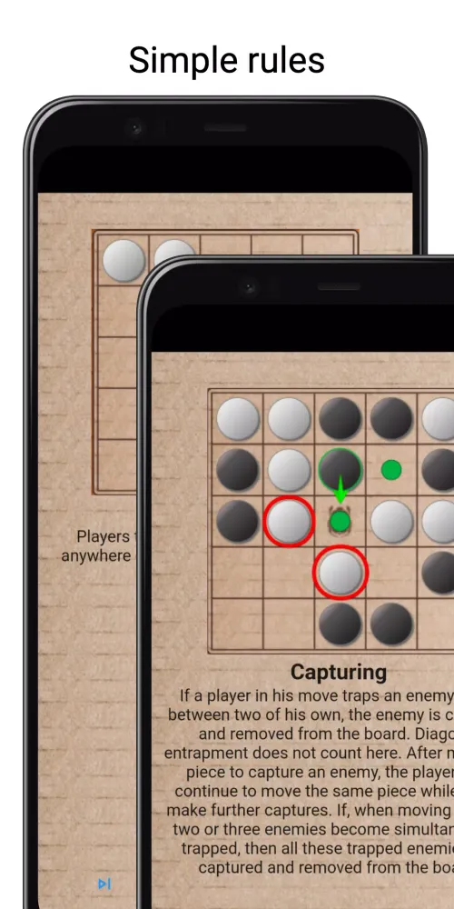 Captures occur when a player's piece traps an opponent's piece between two of their own pieces. Diagonal trapping does not count as a valid capture. After capturing an enemy piece, the player can continue to move the same piece if it can make further captures. If moving a piece results in multiple simultaneous captures, all captured pieces are removed from the board.