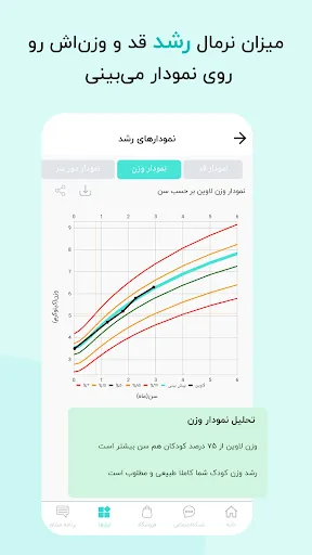• ابزار رشد : با این ابزار میتونین نمودار رشد قد و وزن فرزندتون رو ببینین و فرآیند رشدش رو رصد کنین. علاوه بر این، با ابزار آزمون رشد میتونین رشد حرکتی، شناختی و هیجانی فرزندتون رو هم بسنجین.