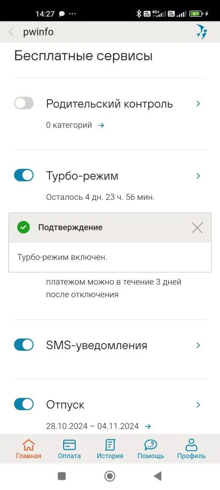 With this application installed, you can easily access detailed information about your personal account, such as balance status, usage statistics, and plan details. The service management section allows you to control various aspects of your subscription, including adding or removing services, adjusting parental controls, enabling or disabling Turbo mode, setting up deferred payments, customizing notification preferences, and managing vacation modes.