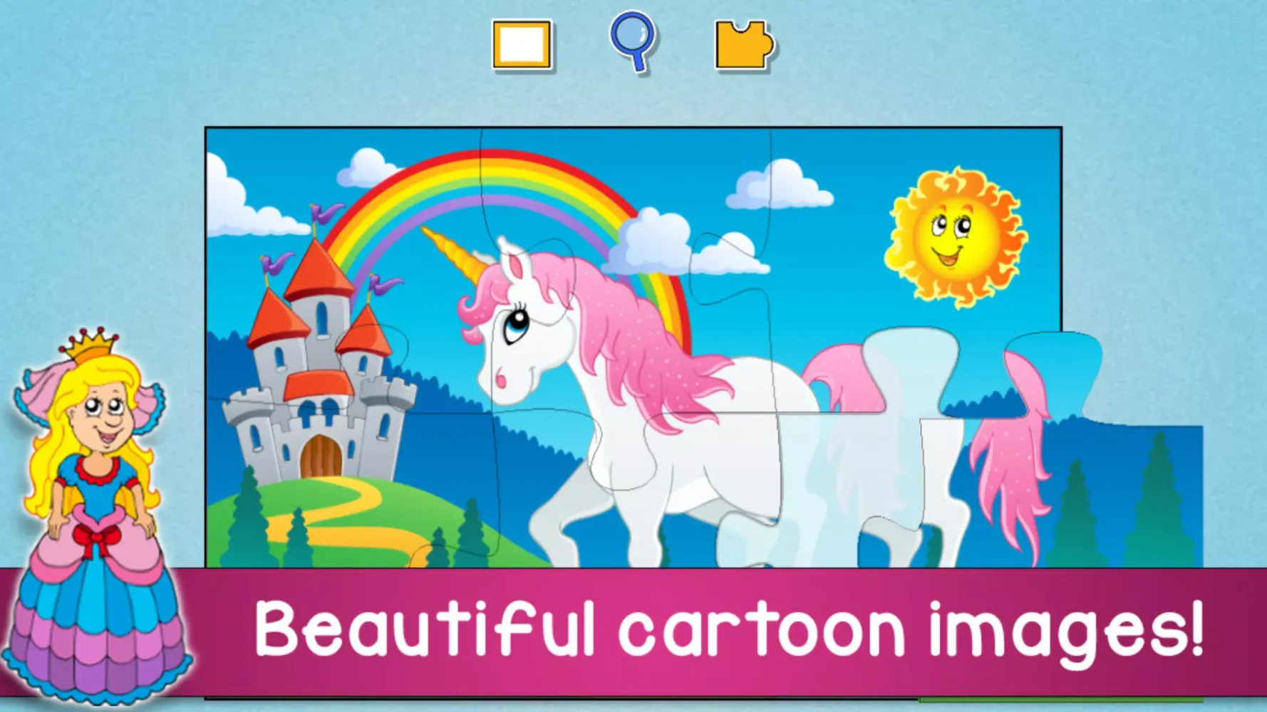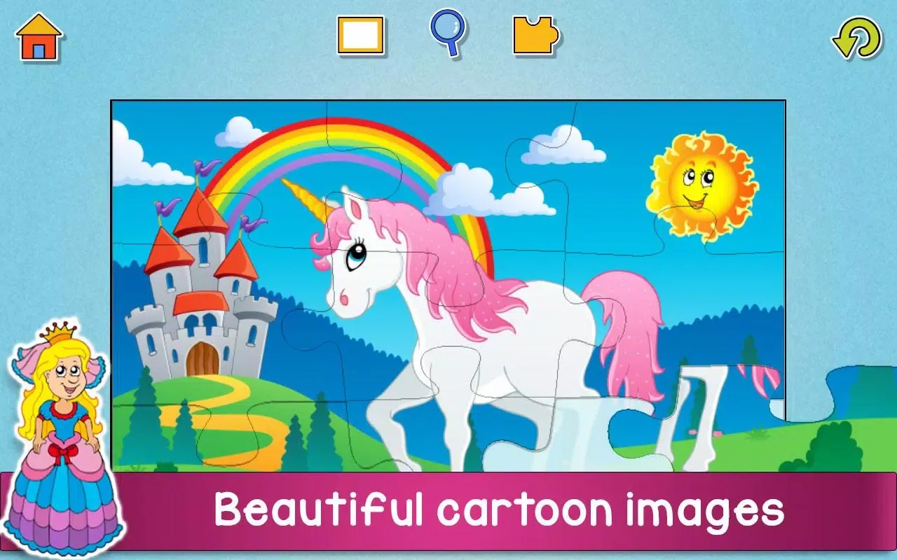 Each puzzle features stunning, high-quality images that are both visually appealing and educational. Complete puzzles featuring magical creatures like unicorns and dragons, as well as exciting scenes like dinosaurs and other whimsical settings. Upon completing each puzzle, you'll be rewarded with fun elements such as balloons, fruits, snowflakes, and more!
